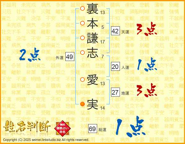 裏(13画)本(5画)謙(17画)志(7画) 愛(13画)実(14画)