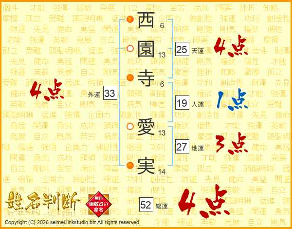 西園寺愛実さんの総運は52画の4点!