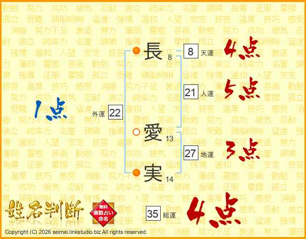 長(8画) 愛(13画)実(14画)