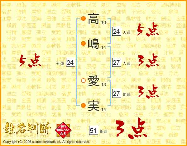 高嶋愛実さんの総運は51画の3点!