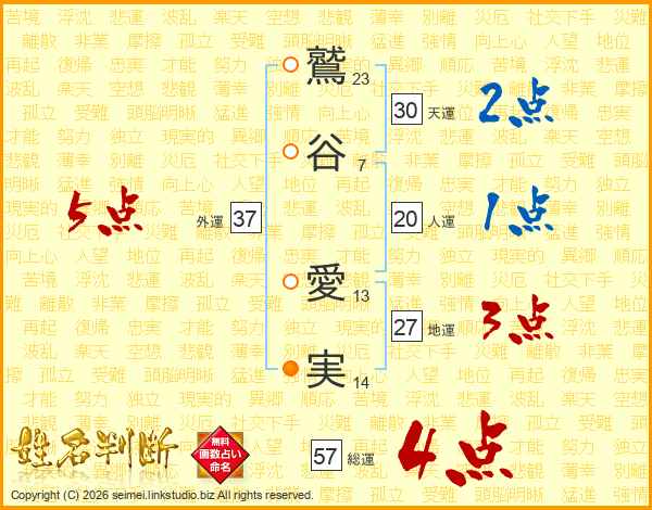 鷲(23画)谷(7画) 愛(13画)実(14画)