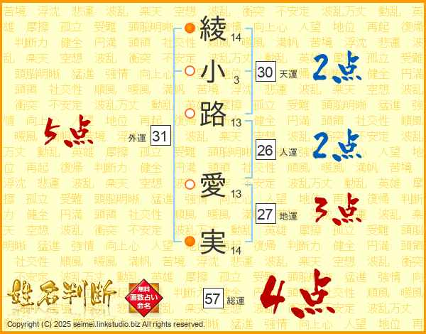 綾(14画)小(3画)路(13画) 愛(13画)実(14画)