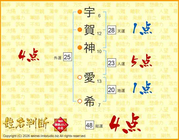 宇(6画)賀(12画)神(10画) 愛(13画)希(7画)