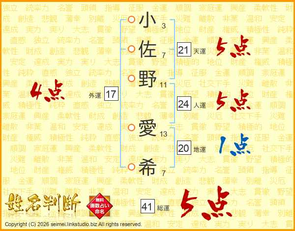 小佐野愛希さんの総運は41画の5点!