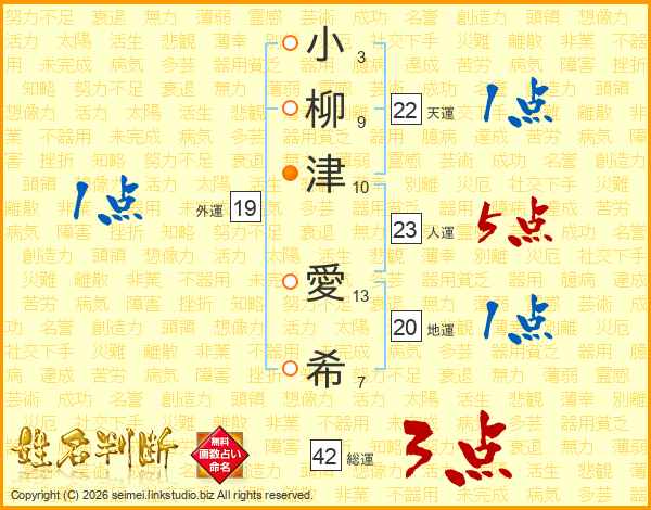 小(3画)柳(9画)津(10画) 愛(13画)希(7画)