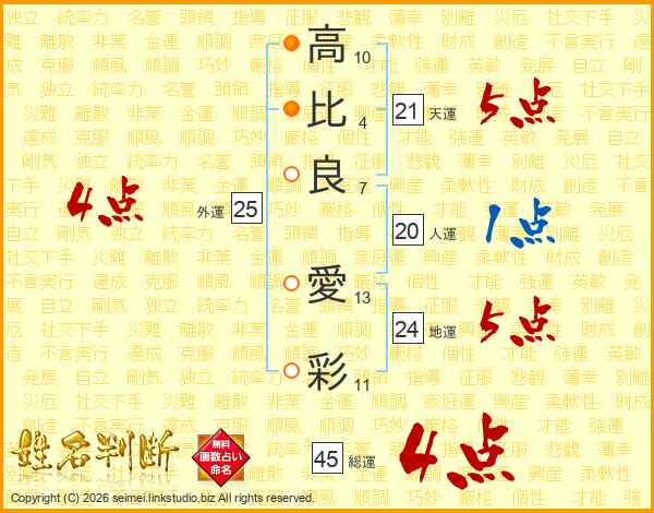 高(10画)比(4画)良(7画) 愛(13画)彩(11画)