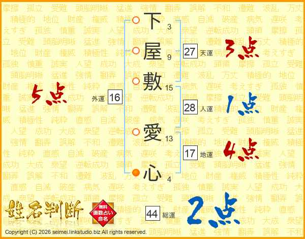 下(3画)屋(9画)敷(15画) 愛(13画)心(4画)