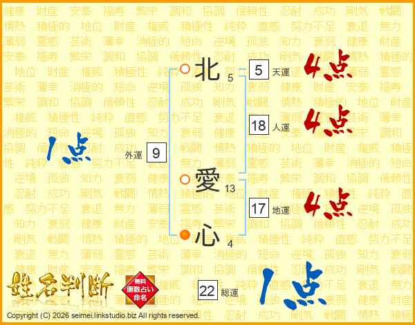 生活面を象徴する運勢です。外部から受ける影響力を表し、結婚運、家庭運や職場、環境への順応性を表します。総運から人運を引いた画数。姓や名が1文字の場合を除く。