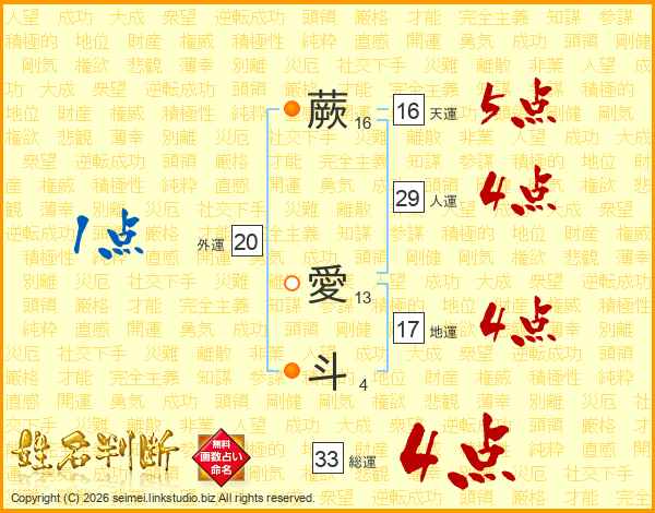 蕨愛斗さんの総運は33画の4点!