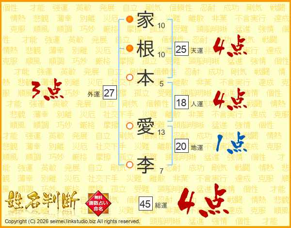 家(10画)根(10画)本(5画) 愛(13画)李(7画)