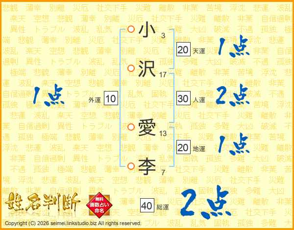 小(3画)沢(17画) 愛(13画)李(7画)