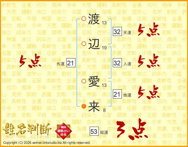 渡(13画)辺(19画) 愛(13画)来(8画)