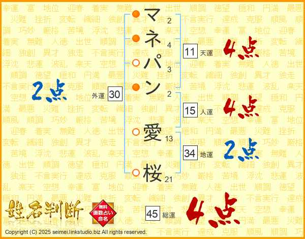 マ(2画)ネ(4画)パ(3画)ン(2画) 愛(13画)桜(21画)