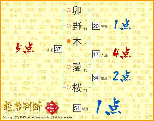 卯(5画)野(11画)木(4画) 愛(13画)桜(21画)