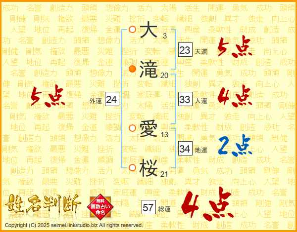 大(3画)滝(20画) 愛(13画)桜(21画)