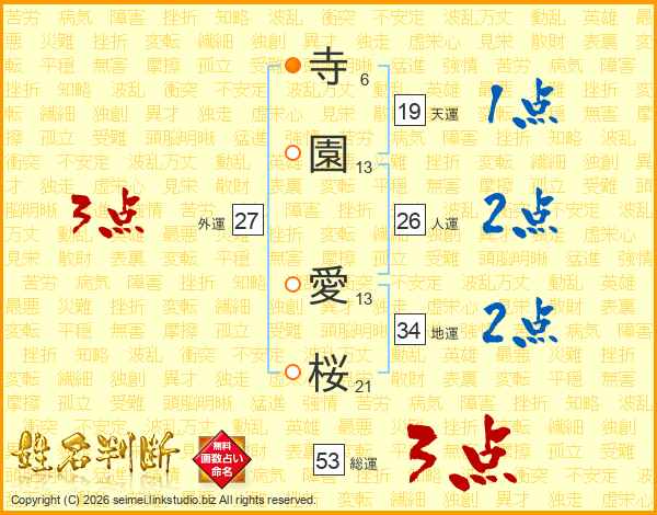 寺(6画)園(13画) 愛(13画)桜(21画)