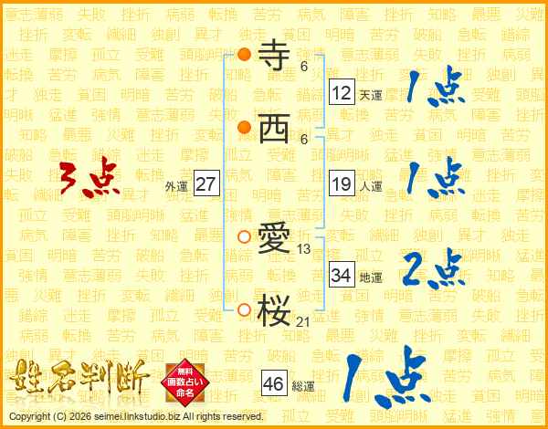 寺西愛桜さんの総運は46画の1点!
