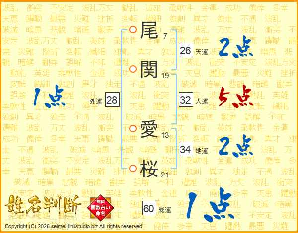 尾(7画)関(19画) 愛(13画)桜(21画)