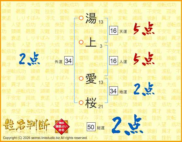 湯(13画)上(3画) 愛(13画)桜(21画)