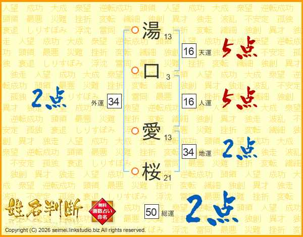 湯(13画)口(3画) 愛(13画)桜(21画)