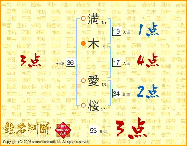 満(15画)木(4画) 愛(13画)桜(21画)
