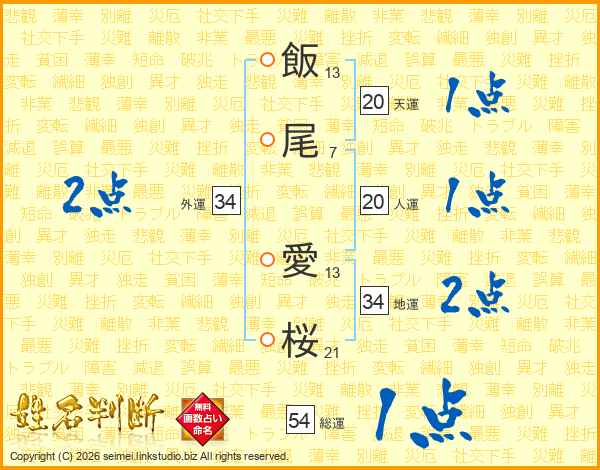 飯(13画)尾(7画) 愛(13画)桜(21画)