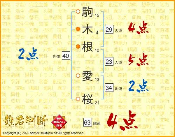 駒(15画)木(4画)根(10画) 愛(13画)桜(21画)