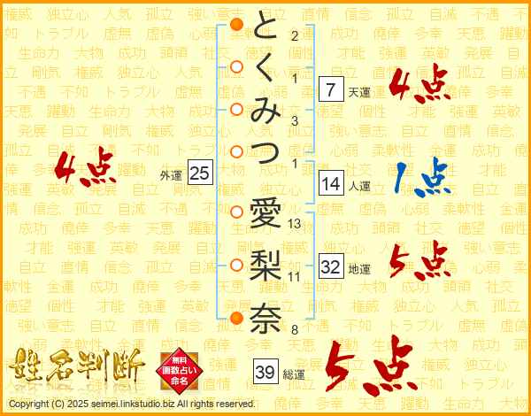 と(2画)く(1画)み(3画)つ(1画) 愛(13画)梨(11画)奈(8画)