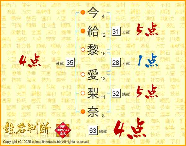 今(4画)給(12画)黎(15画) 愛(13画)梨(11画)奈(8画)