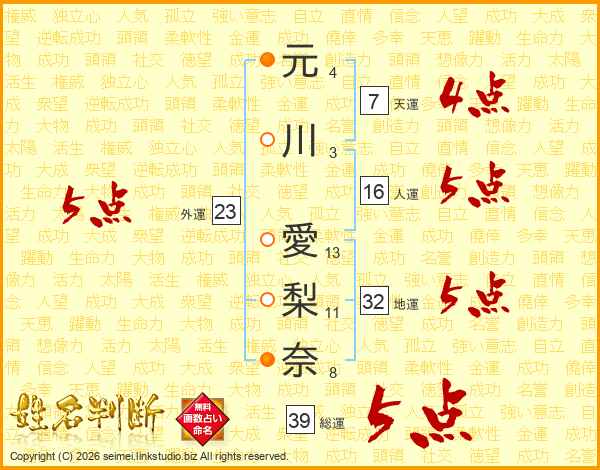 元(4画)川(3画) 愛(13画)梨(11画)奈(8画)