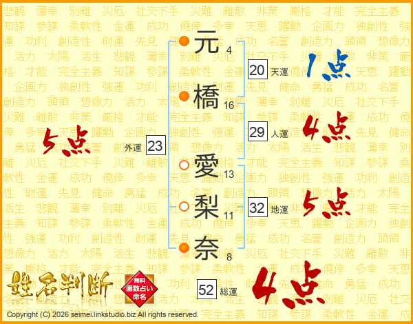 元(4画)橋(16画) 愛(13画)梨(11画)奈(8画)