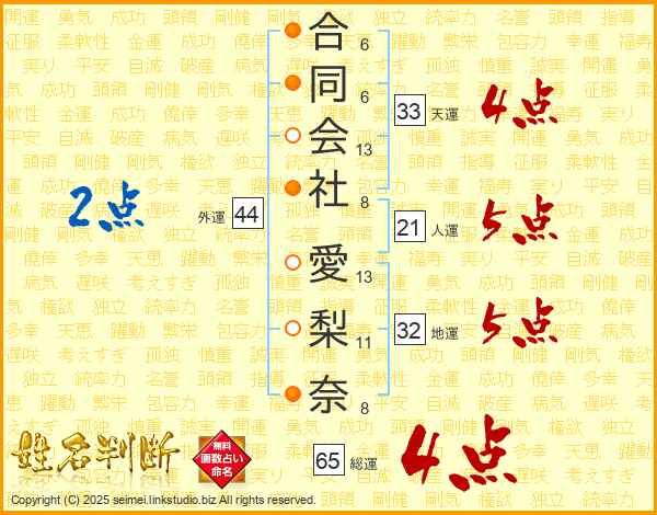 合(6画)同(6画)会(13画)社(8画) 愛(13画)梨(11画)奈(8画)