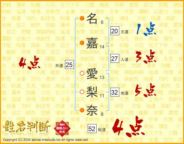 名(6画)嘉(14画) 愛(13画)梨(11画)奈(8画)