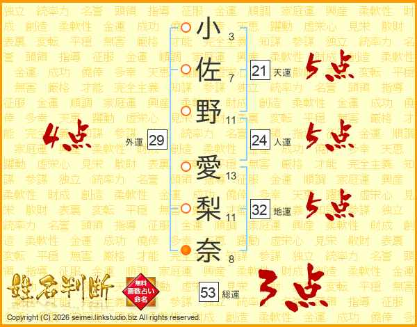 小佐野愛梨奈さんの総運は53画の3点!