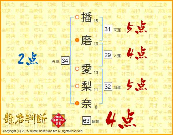 播(15画)磨(16画) 愛(13画)梨(11画)奈(8画)