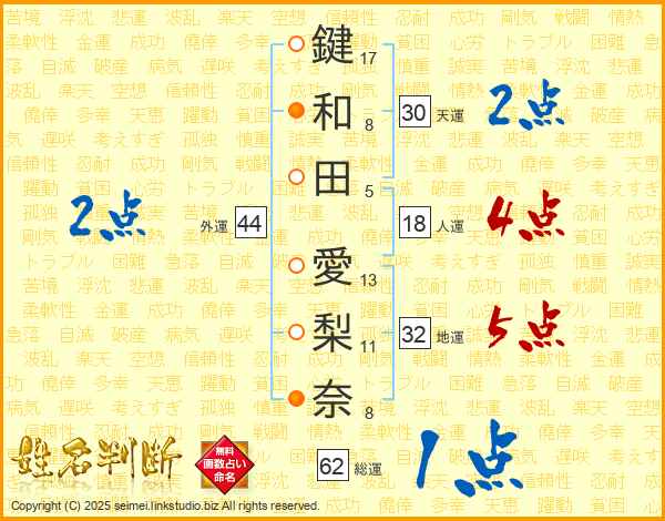 鍵(17画)和(8画)田(5画) 愛(13画)梨(11画)奈(8画)