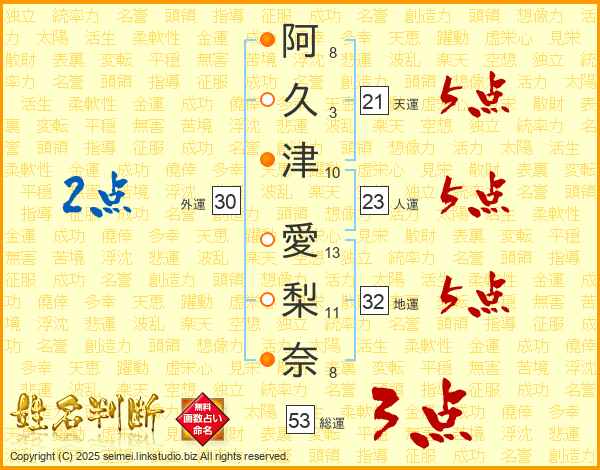 阿(8画)久(3画)津(10画) 愛(13画)梨(11画)奈(8画)