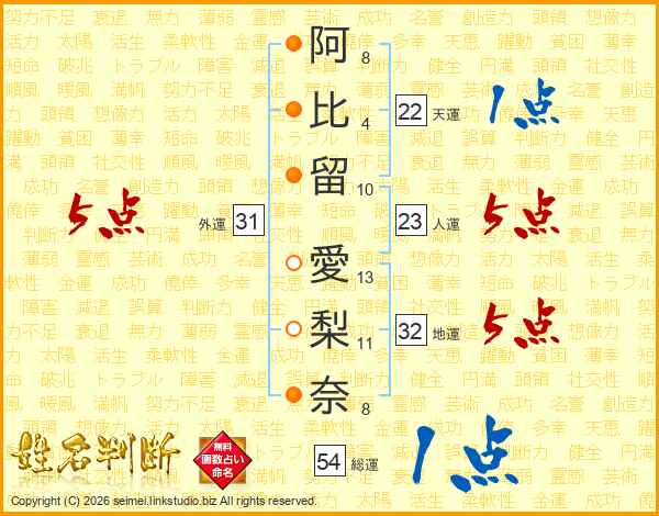 阿(8画)比(4画)留(10画) 愛(13画)梨(11画)奈(8画)