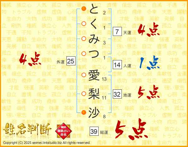 と(2画)く(1画)み(3画)つ(1画) 愛(13画)梨(11画)沙(8画)