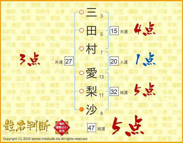 三田村愛梨沙さんの総運は47画の5点!