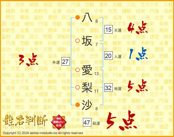 八(8画)坂(7画) 愛(13画)梨(11画)沙(8画)