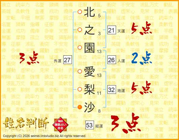 北(5画)之(3画)園(13画) 愛(13画)梨(11画)沙(8画)