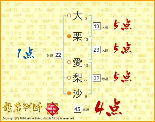 大(3画)栗(10画) 愛(13画)梨(11画)沙(8画)