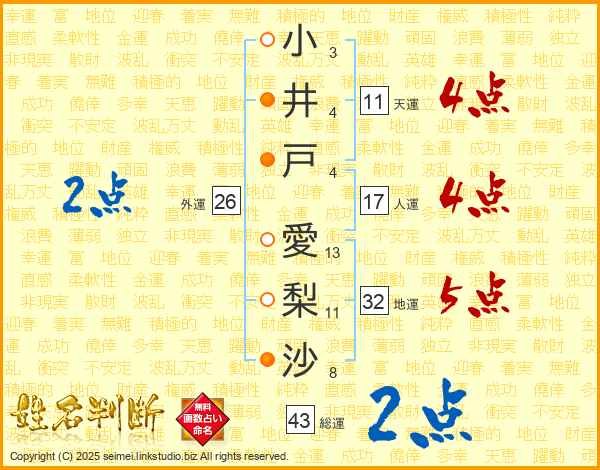 小(3画)井(4画)戸(4画) 愛(13画)梨(11画)沙(8画)