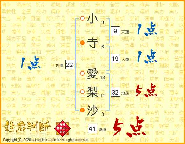 小(3画)寺(6画) 愛(13画)梨(11画)沙(8画)