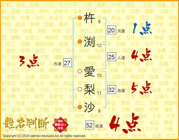 杵(8画)渕(12画) 愛(13画)梨(11画)沙(8画)