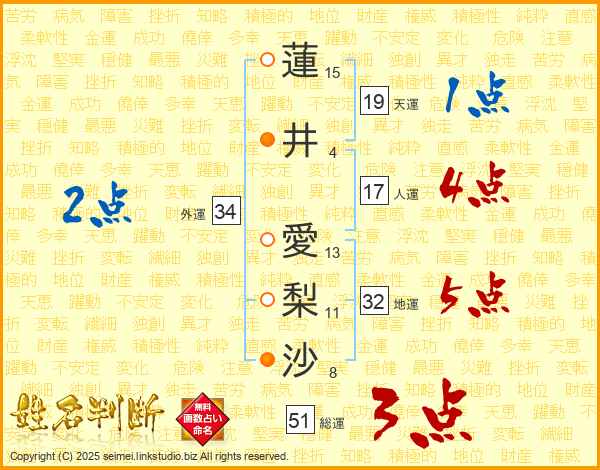 蓮(15画)井(4画) 愛(13画)梨(11画)沙(8画)