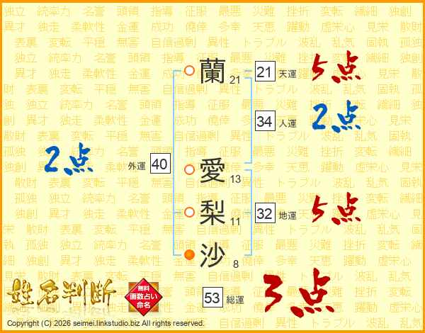 蘭(21画) 愛(13画)梨(11画)沙(8画)