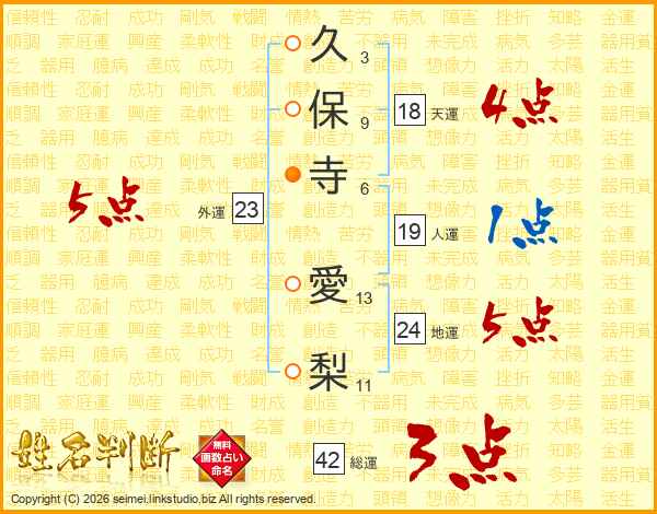 久(3画)保(9画)寺(6画) 愛(13画)梨(11画)