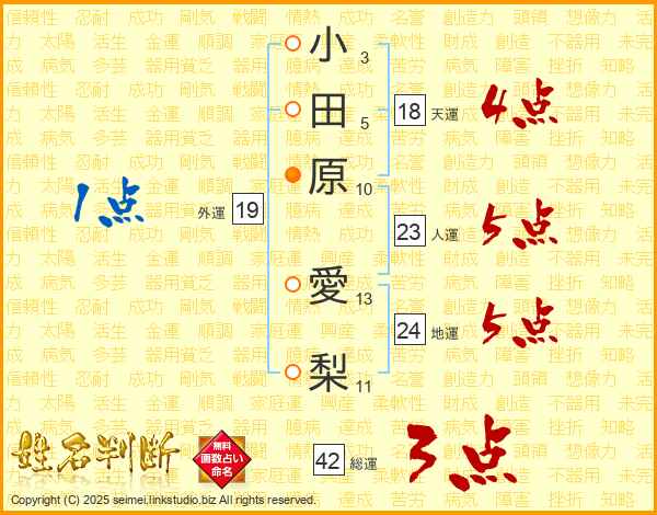 小(3画)田(5画)原(10画) 愛(13画)梨(11画)